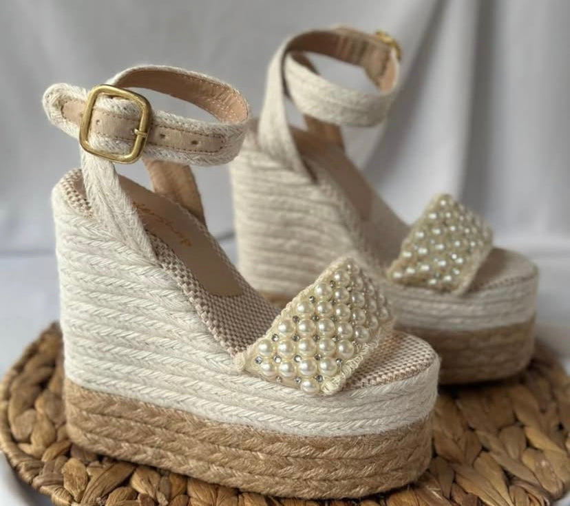 Plataformas con tira en yute artesanal que se ajusta al tobillo, con accesorios llamativos Perlas que te hacen lucir auténtica.